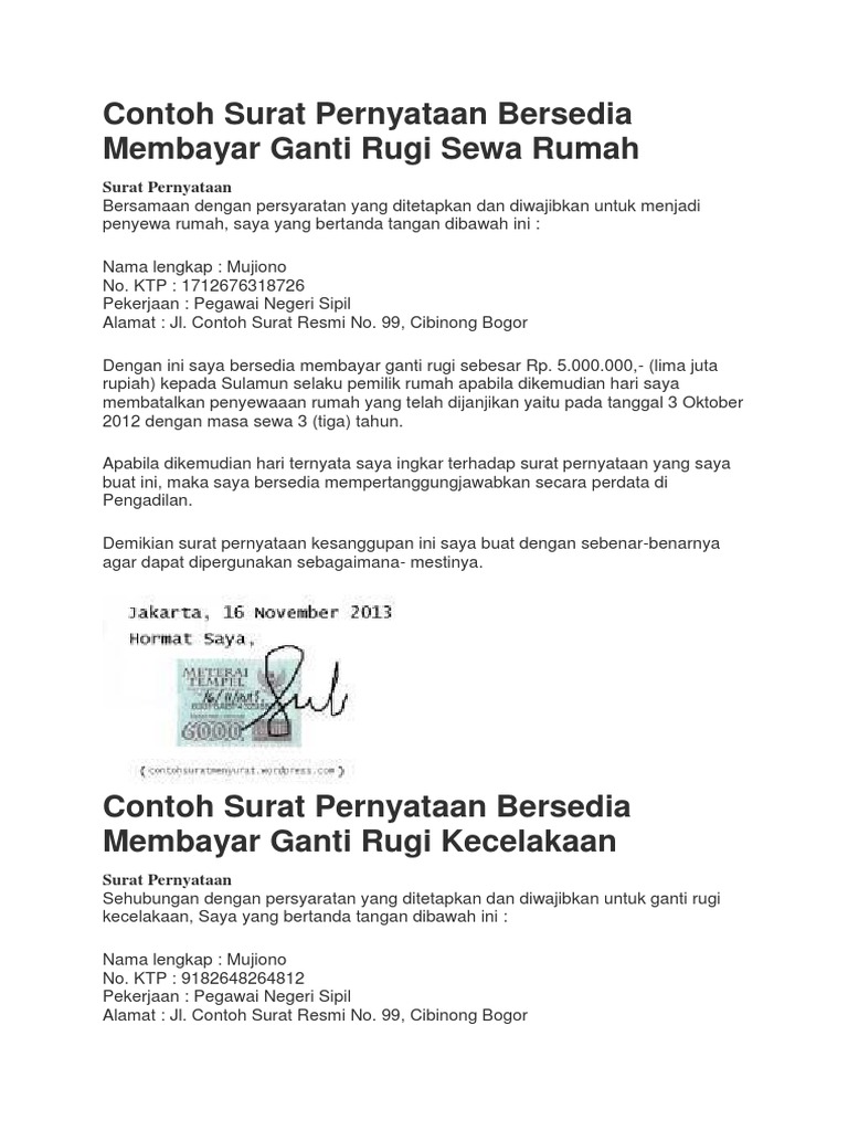 9 Contoh Surat Pernyataan Bersedia Membayar Ganti Rugi Format Word